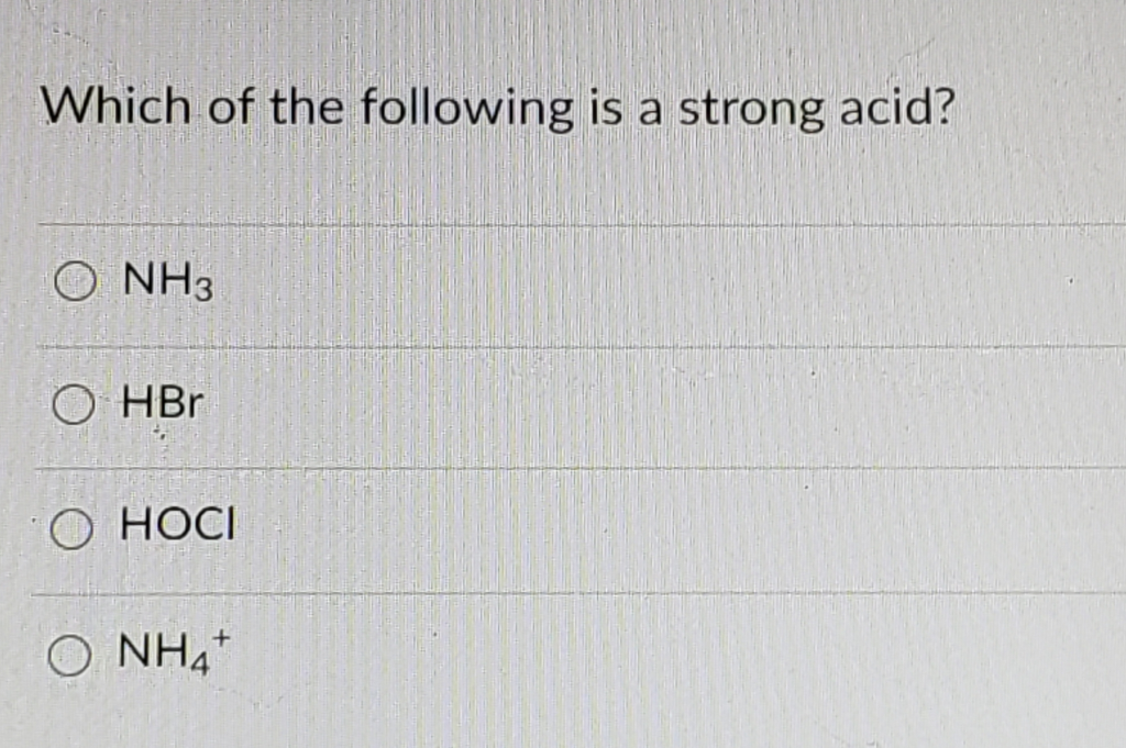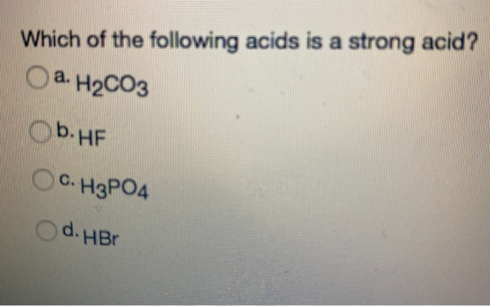 Solved Which Of The Following Is A Strong Acid O Nh3 Hbr Chegg Com