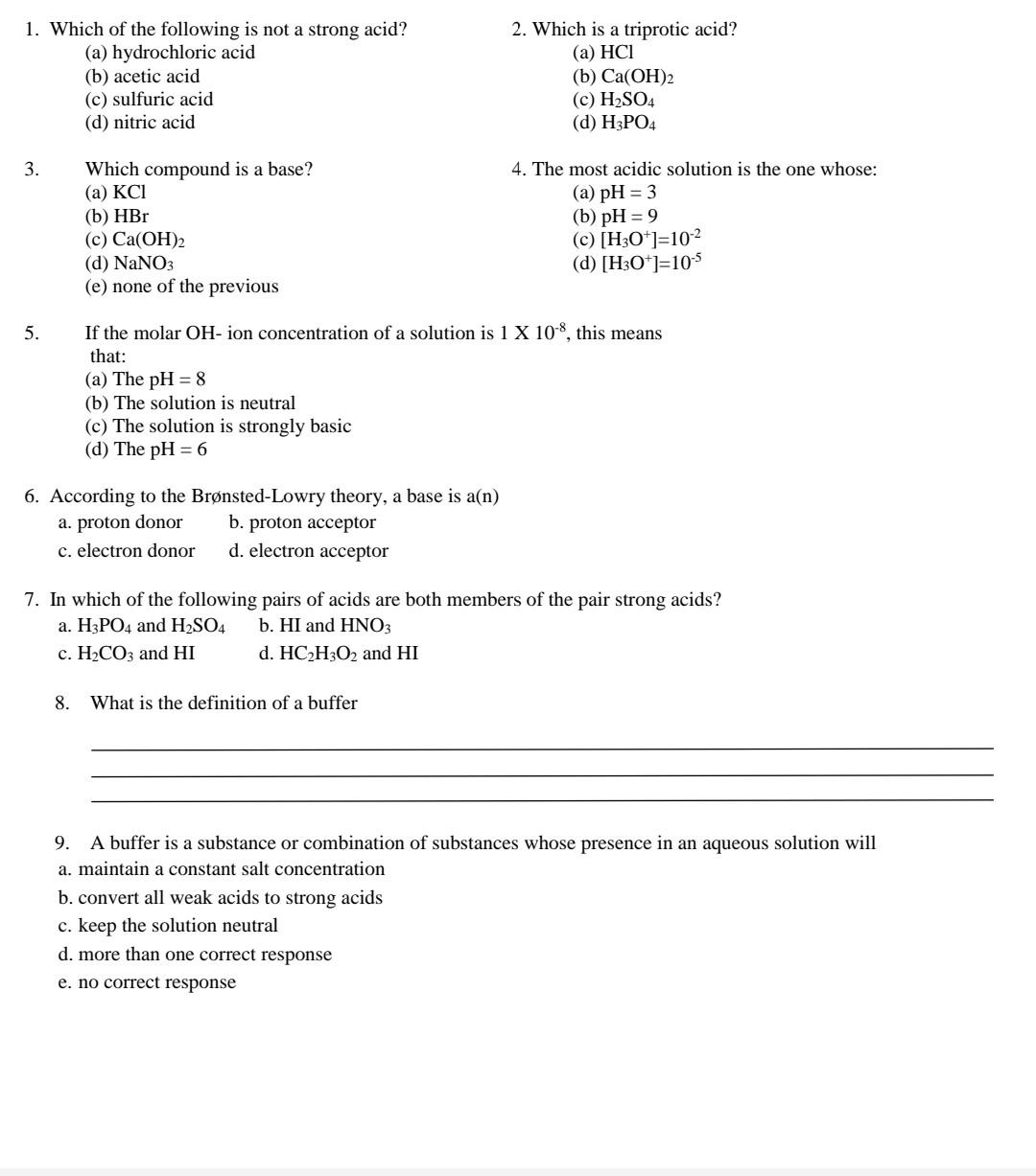 5 Which of the following is not a strong acid. Which one of the following will give a solution with a pH 7 but is not an Arrhenius base in the strict sense. Which of the following is not a strong acid in aqueous solution.