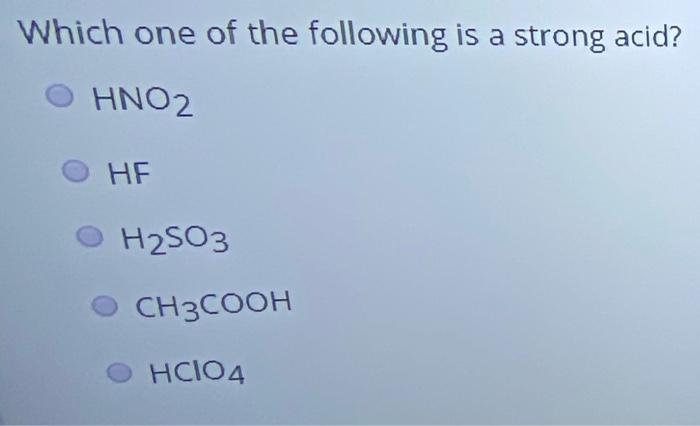 We review their content and use your feedback to keep the quality high. Experts are tested by Chegg as specialists in their subject area. Which of the following is not a strong acid.